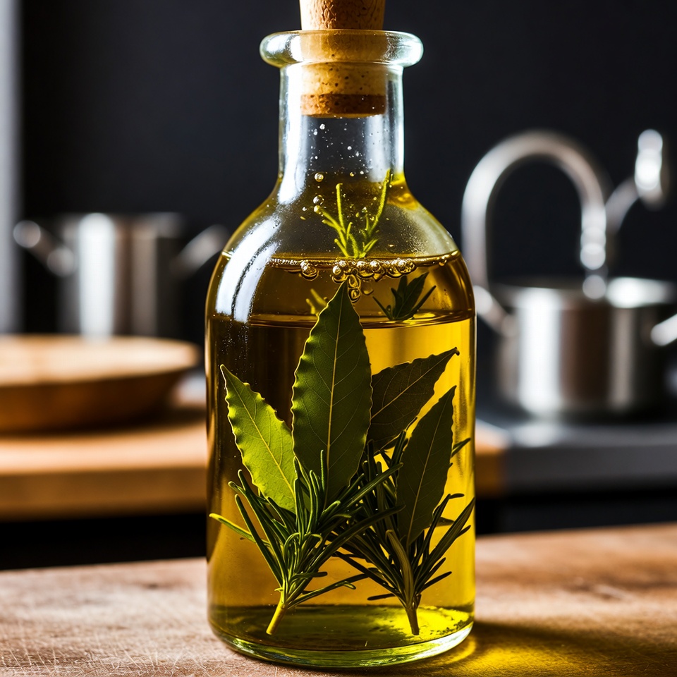 Aromatisiertes Olivenöl mit Lorbeerblättern und Rosmarin