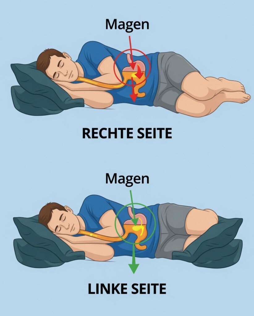 Wer zu Reflux oder Sodbrennen neigt, sollte die rechte Seitenlage möglichst meiden. Liegt man auf der rechten Seite, kann Magensäure leichter in die Speiseröhre zurückfließen.