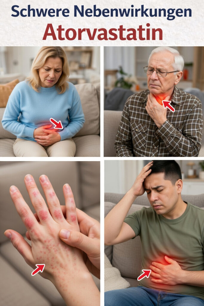 Schwerwiegende Komplikationen sind bei Atorvastatin selten. Gesundheitsbehörden wie die FDA und die Mayo Clinic weisen jedoch auf einige Reaktionen hin, die sofortige ärztliche Abklärung erfordern.
