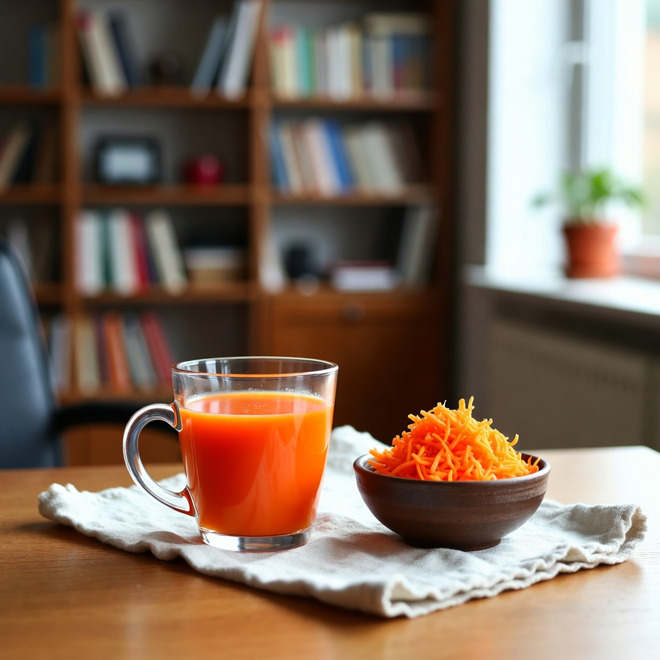 • Frischer Karottensaft: Entsafte 3 Karotten mit 1 Orange und einer Scheibe Ingwer.